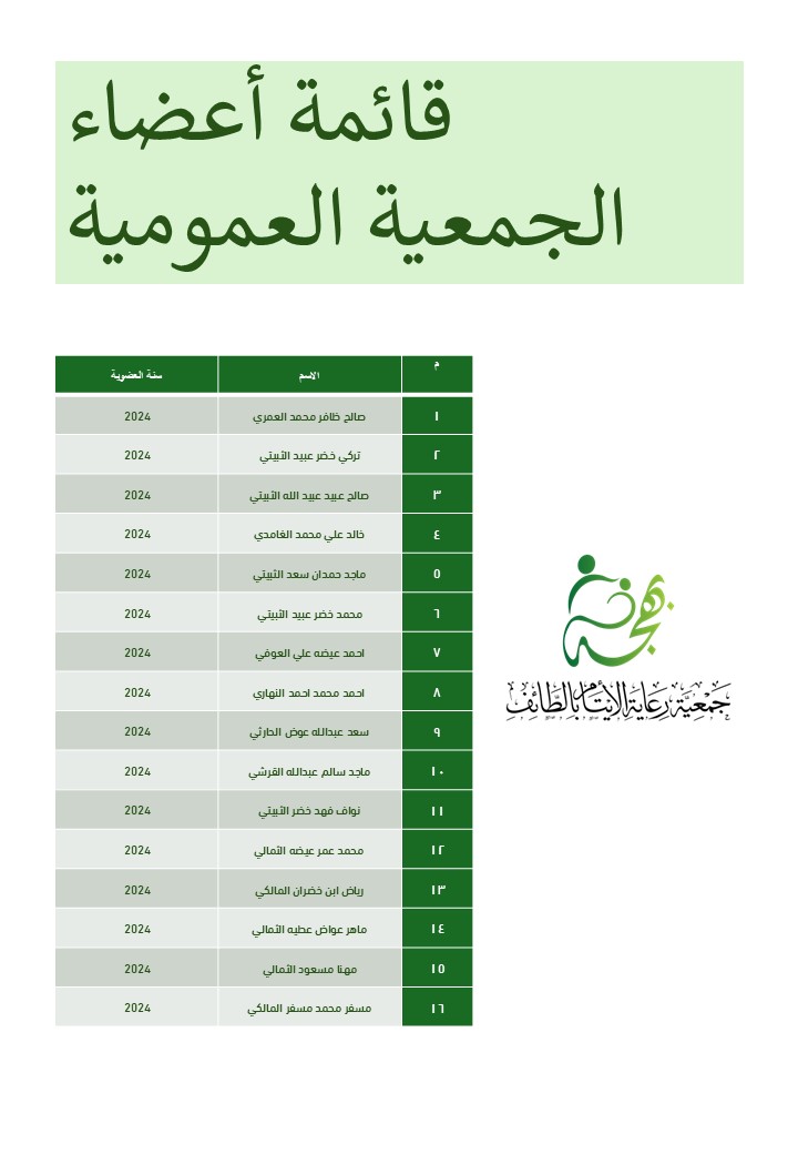 يُشكل أعضاء الجمعية العمومية الدعامة الأساسية في مسيرة الجمعية، حيث يجتمعون بروح التعاون والتفاني في سبيل تحقيق الأهداف المشتركة وتعزيز قيم العمل المجتمعي. قائمة أعضاء الجمعية العمومية